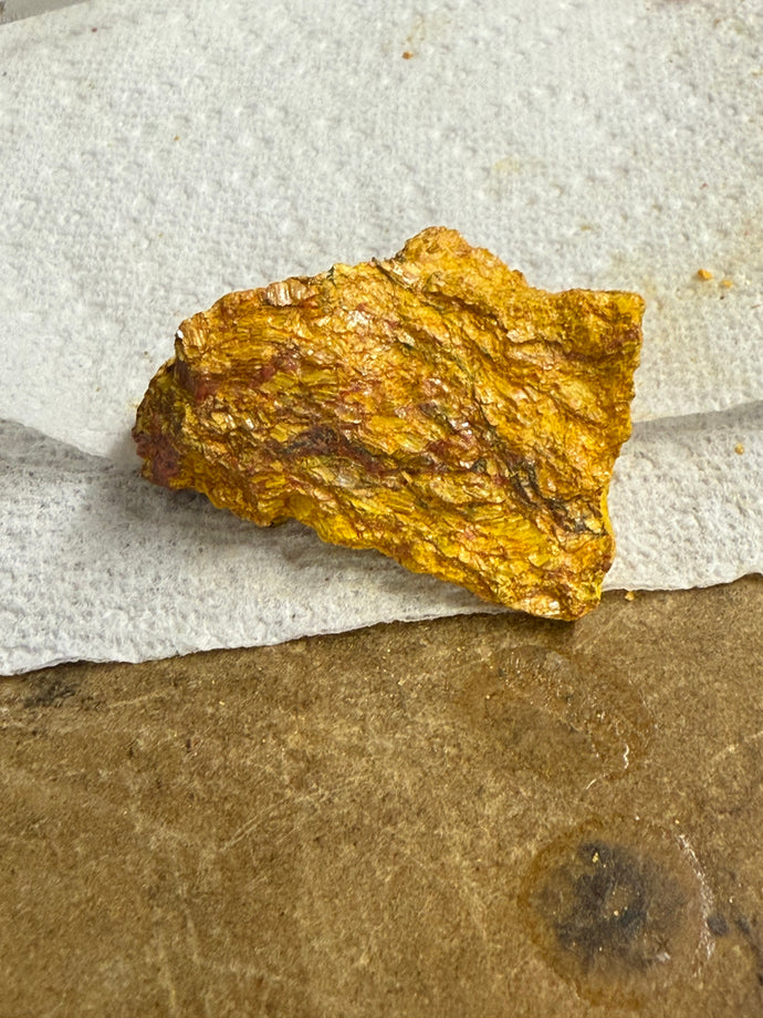Orpiment resonates with one's solar plexus chakra, specifically one’s personal will. Your “will” will become activated and aligned with your emotional body. This will help you become more in touch with your personal desires. Your energy level will increase when using this stone, as well as your focus, strength, and confidence. One will notice themselves having a different perception of the things and people closest to them, resulting in a possible change of environment. Now that one is fully aligned and focused on their dreams, any baggage they carry that does not serve them will soon be replaced. This is not only healthy for someone with high aspirations, but also extremely challenging for anyone to do. Orpiment makes this process much less stressful and emotionally taxing by being a constant reminder of what’s most important to you.
